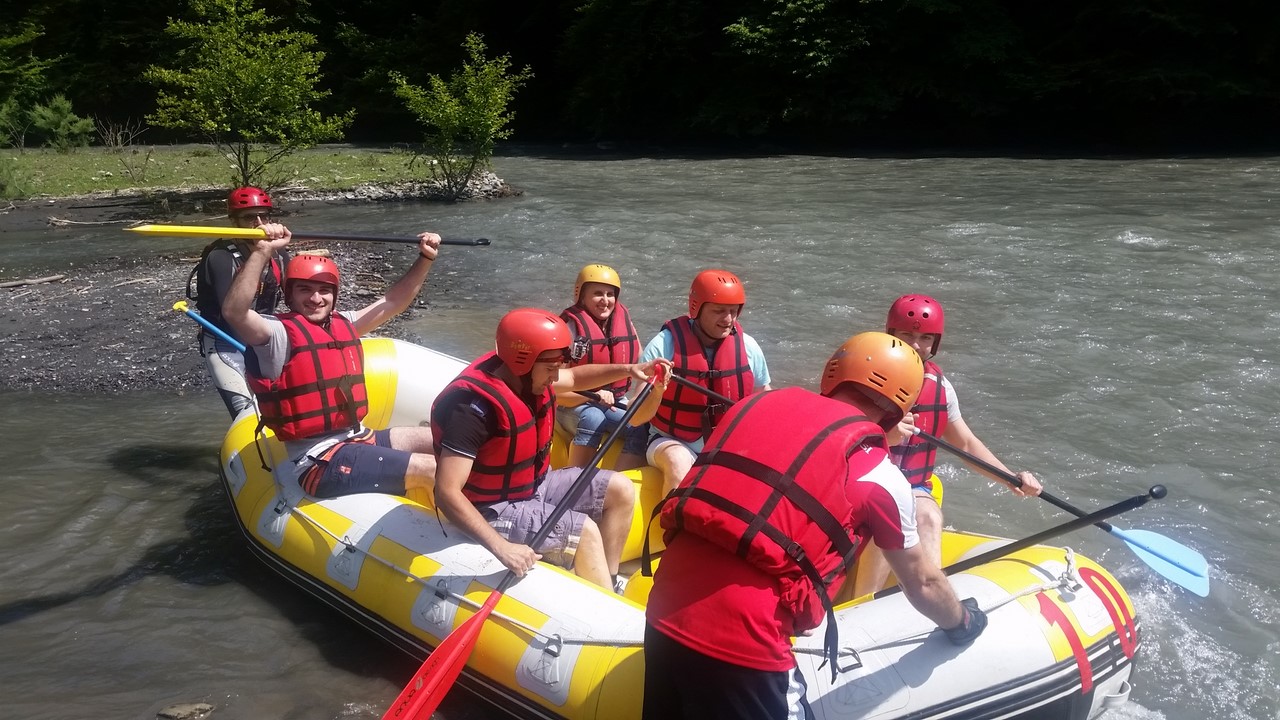 В солнечную погоду красивые пейзажи были более впечатляющие.Организаторы постарались,чтобы день был незабываемым,интересным, и все его участники чувствовали себя комфортно.Когда наши сотрудники готовились спустится на реку на лодках,другая часть сотрудников принимала участие в спортивно-развлекательном соревновании, в конкурсах танцев . О самочувствии участников заботился специально приглашенный диджей.Участники рафтинга были довольны встречей с волнами реки.Как они отметили ,почувствовали прилив адреналина и энергии.Все сотрудники нашей клиники хорошо развлеклись . Их положительные эмоции хорошо выявились в социальной сети в виде фотографий.Селфами снятыми на реке, одетые в униформу рафтинга, с улыбающимися лицами, с танцующей молодёжью ,под мелодичную музыку диджея,с сотрудниками включёнными в разные спортивные мероприятия,вы поверите, что день правда был полон позитива.На берегу Арагви царствовало веселье и азартная обстановка.